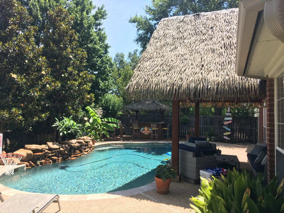 This project highlights our residential pools, landscaping, and custom patio covers. We incorporate different aspects of poolside patio trends, tropical thatch umbrellas, and wooden gazebo structures with fencing. We also built the custom tiki-bar here.